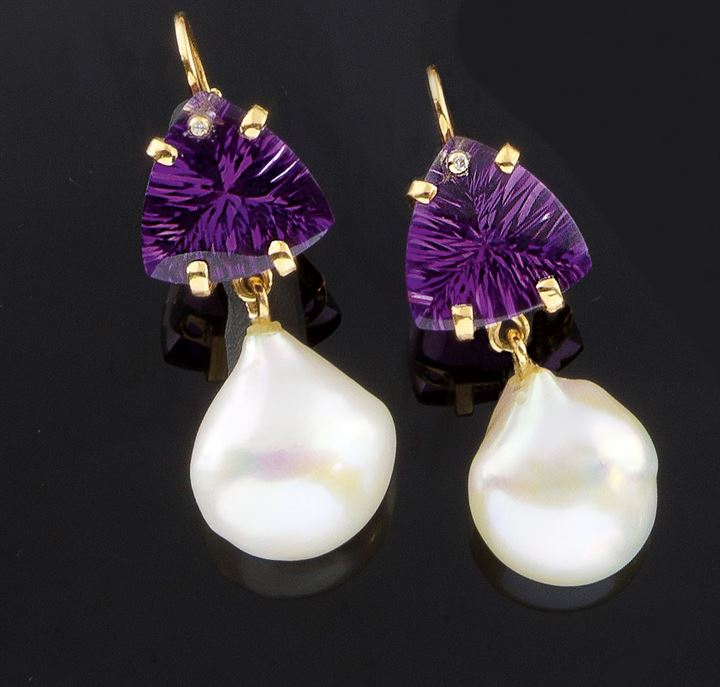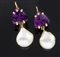 Coppia di orecchini in oro giallo con due perle barocche pendenti sormontate da due ametiste taglio fantasia