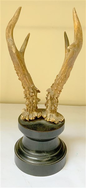 Trofeo di camoscio su base in legno tornito ed ebanizzato (h cm 25)