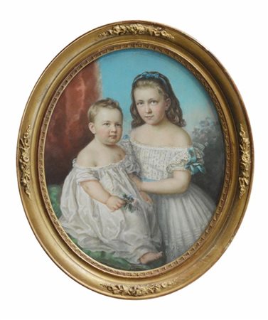 Scuola del XIX Secolo "Rirtatto di fanciulla e bimbo" pastelli colorati (cm 59x
