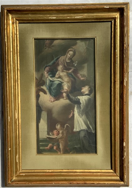 Scuola della fine del secolo XVIII "Madonna con Bambino e Santo" olio su tela (cm 34x22). In cornice