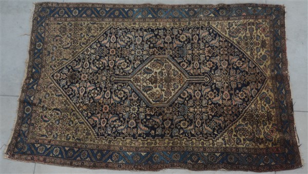 Decoro con medaglione esagonale a fondo bianco su campo blu. Angolari gialli decorati con motivo Herati. (cm 197x137) (Difetti)