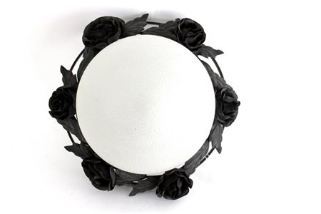 Plafoniera in metallo decorata a motivo di rose a tutto tondo, paralume in vetro decorato in rilievo (d cm 34)