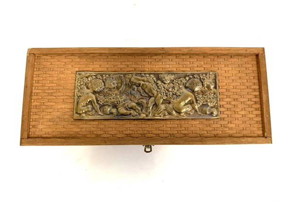 Scatola in legno decorata con placca in rame sbalzata a giochi di putti contene
