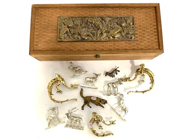 Scatola in legno decorata con placca in rame sbalzata a giochi di putti contenente undici piccole sculture in metallo raffiguranti animali diversi (difetti)