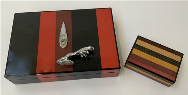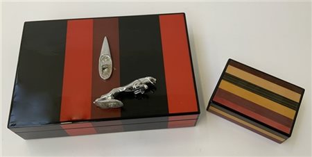Lotto di due scatole portasigari in legno laccato e colorato, una con coperchio sormontato da stemma Jaguar in metallo (cm max 35x7x24) (lievi difetti)