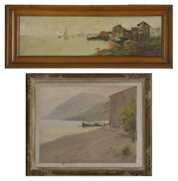 Lotto di due dipinti ad olio raffiguranti "Scorci con barche" autori e misure d
