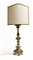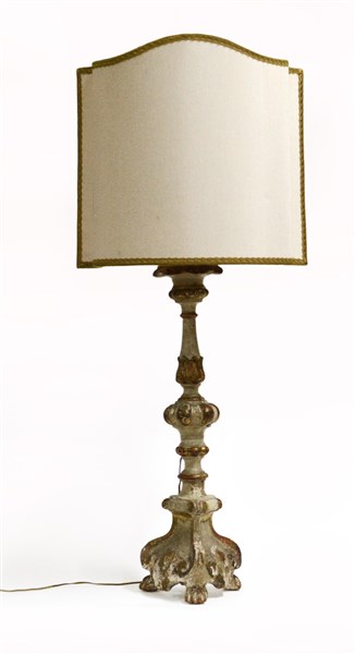 Candeliere tripode in legno laccato avorio e parzialmente dorato ed intagliato, secolo XVIII (h cm 57)(Montato a luce elettrica in epoca posteriore, paralume in stoffa) (difetti e mancanze)