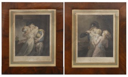 Coppia di litografie francesi a colori del secolo XIX raffiguranti "La partenza ed il ritorno del soldato" (cm 50x37) in cornici lastronate in noce dell'epoca (difetti)