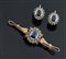Demi-parure in oro giallo e argento composta da spilla a forma di barretta e con al centro zaffiro di taglio