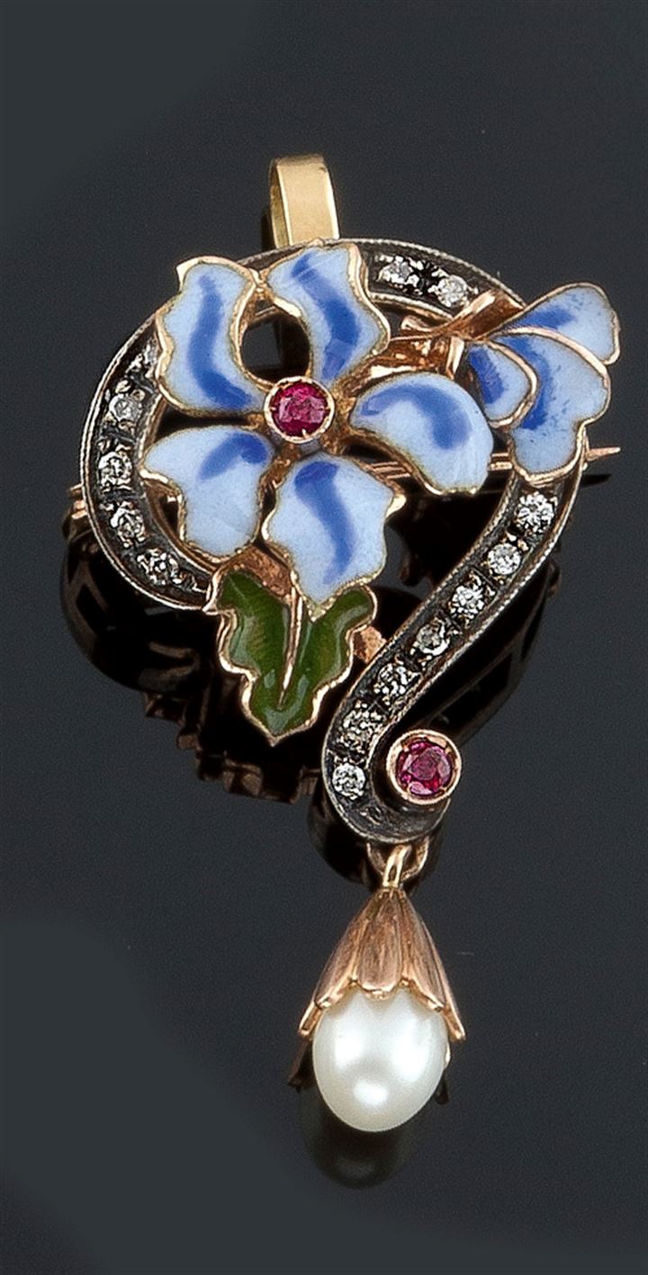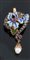Spilla ciondolo in oro giallo con al centro iris in smalto policromo e perla pendente; diamanti taglio brillante e 8/8 per complessivi ct 0,15,