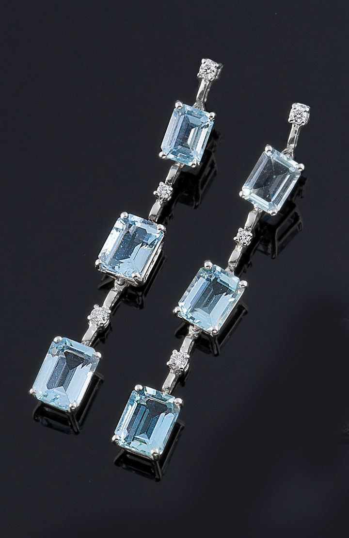 Coppia di orecchini pendenti in oro bianco con sei acquamarine a scalare di taglio rettangolare