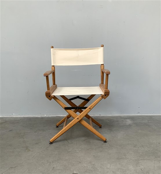 Sedia pieghevole da regista con struttura in legno. Granville, New York, anni '80. Struttura in legno, schienale e seduta in cotone beige. Recante etichetta metallica della produzione. (cm 60x87x40) (lievi difetti)