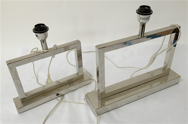 Lotto di due lampade da tavolo in ottone cromato, paralume in carta. Italia, produzione recente. Recante etichetta del produttore sotto la base. (cm max 46x57x20) (lievi difetti)