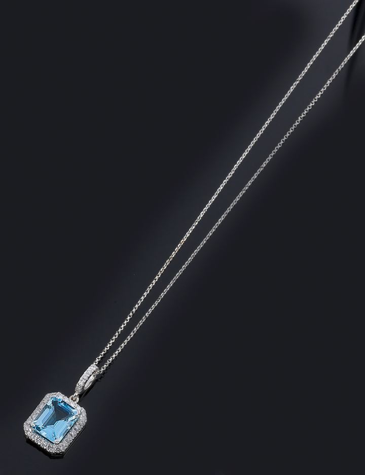Catena con ciondolo in oro bianco con acquamarina taglio rettangolare circondata da diamanti taglio brillante per complessivi ct 0,55 ca