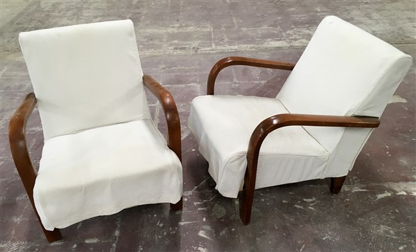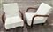 Coppia di poltrone imbottite e rivestite in tessuto bianco, struttura in legno massello. Italia, anni '30. (cm 66x76x78) (lievi difetti e restauri)