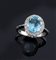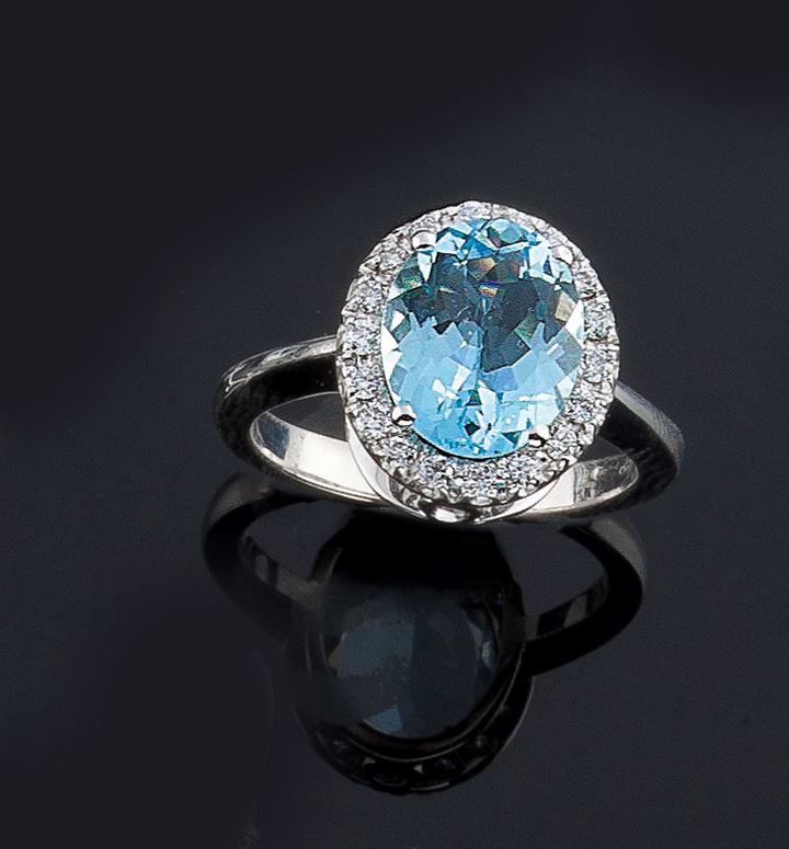 Anello in oro bianco con al centro acquamarina di taglio ovale contornata da diamanti taglio brillante