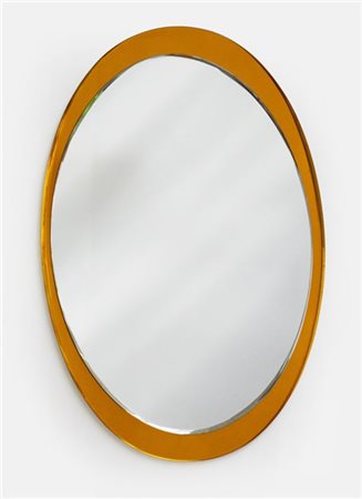 Specchiera ovale con cornice specchiata arancione. Siena, 1973. Recante etichetta adesiva al retro. (cm 89x59) (lievi difetti)