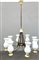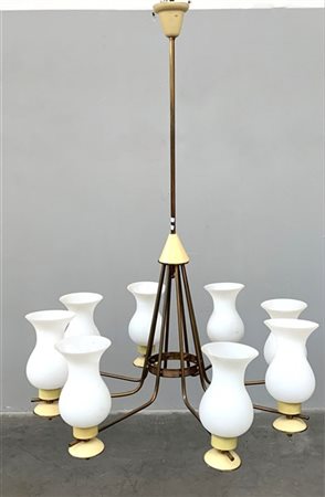 Lampada a sospensione a otto braccia in ottone e alluminio laccato color créme e verdino, diffusori in vetro incamiciato lattimo acidato sulla super esterna. Italia, anni '50/'60. (h cm 95; d cm 60) (lievi difetti)