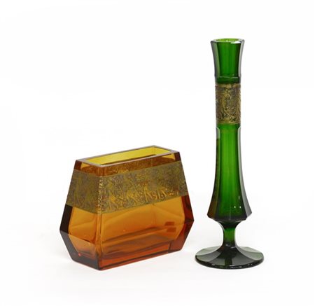 Lotto di un vaso in cristallo arancione ed uno in cristallo verde con fasce dorate. Cecoslovacchia, secolo XX. Firmati a punta sotto la base. (h max cm 29) (difetti)