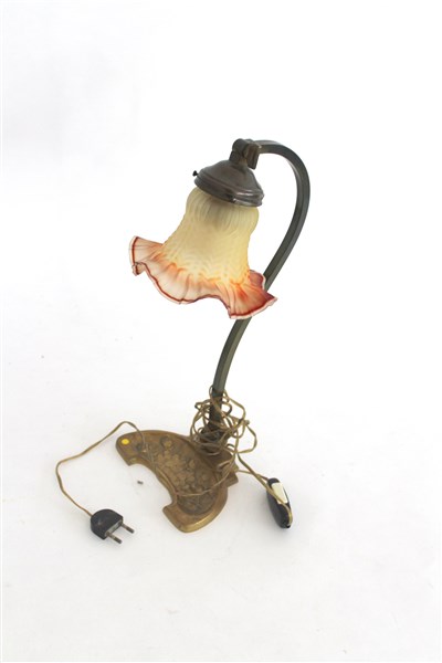 Lampada da tavolo di gusto Liberty con paralume in vetro a foggia di fiore, fusto in ottone. Secolo XX. (h cm 40) (lievi difetti)