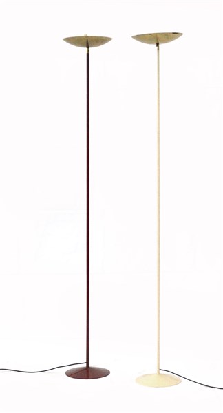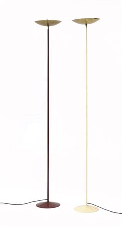 Lotto di due lampade da terra alogene con base e fusto in metallo verniciato bordeaux e bianco, paralume a coppa orientabile e snodo in ottone. Italia, anni '80. (h cm 181) (lievi difetti)