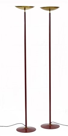 Lotto di due lampade da terra alogene con base e fusto in metallo verniciato bordeaux, paralume a coppa orientabile e snodo in ottone. Italia, anni '80. (h cm 181) (lievi difetti)