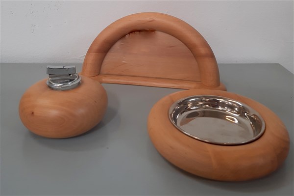 Set composto da una cornice portafoto, un accendino e un posacenere in legno massello. Italia, 1980. Marcato a fuoco sotto la base. (misure diverse)