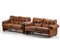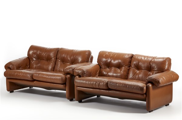 Due divani imbottiti a due posti modello "Coronado". Produzione B&B, Italia, 1966. Rivestimento in pelle terra di Siena. (cm 150x77x90) (difetti)