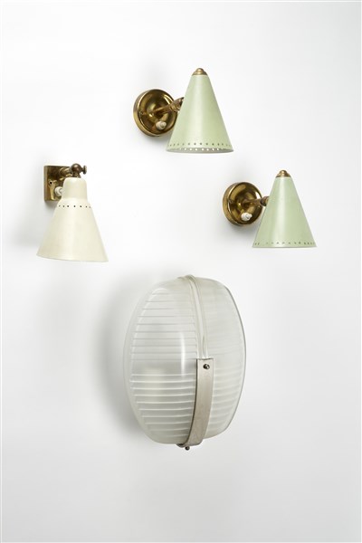 Lotto composto da una coppia appliques in ottone e alluminio verniciato verdino, una applique singola in ottone e alluminio verniciato bianco e una lampada da parete di Vico Magistretti modello "Lambda" in metallo cromato e paralume composto da due valve in vetro a stampo acidato, produzione Artemide. Italia, anni '60. (misure diverse) (lievi difetti)