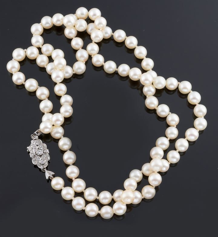 Lunga collana di perle giapponesi dal diam di mm 7,9 a 8,3; chiusura in oro bianco con
