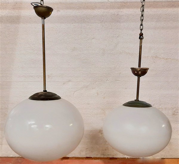 Lotto di due lampade a sospensione con struttura in ottone e paralumi in vetro lattimo acidato sulla superficie esterna di forma schiacciata. Italia, anni '50. (h max cm 65; d cmax cm 35) (lievi difetti)