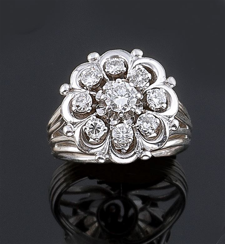 Anello in oro bianco, sommità a forma di fiore, con diamanti taglio brillante per complessivi ct 0,90ca