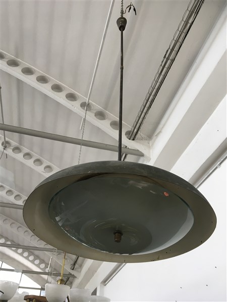 Lampada a sospensione con struttura in ottone, calotta in ottone stampato, disco diffusore in vetro acidato sulla superficie interna. Italia, anni '50. (h cm 160; d cm 55) (difetti)