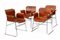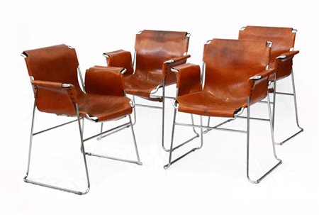 Lotto di quattro sedie con braccioli con struttura in tubolare metallico, seduta e schienale in cuoio color terra di Siena. Italia, anni '80. (cm 63x79x60) (difetti, rotture e mancanze)