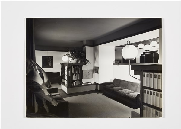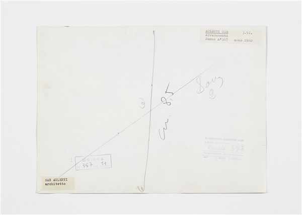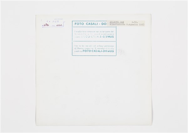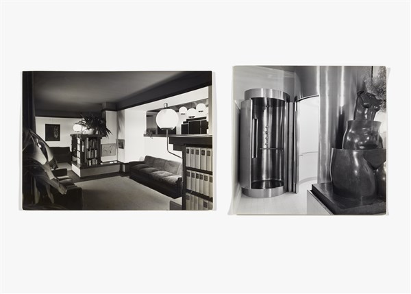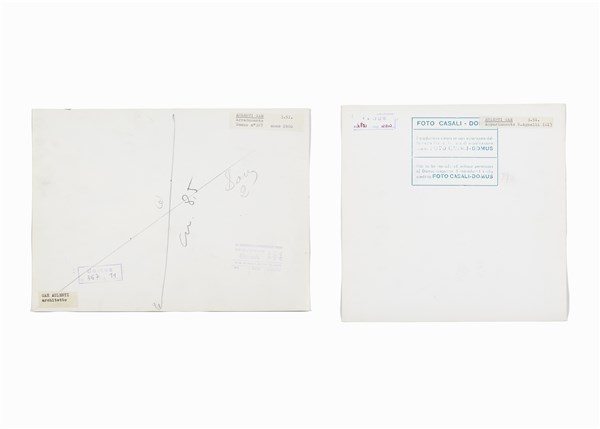 Lotto composto da due fotografie d'epoca raffiguranti "Appartamento di Gianni Agnelli a Milano", Italia 1969 e "Interno di Gae Aulenti a Milano", Italia 1965. Marcate rispettivamente al verso "Foto Casali - Domus" e recante etichetta adesiva " Aulenti Gae Arredamento Domus 367 anno 1967". (cm 23,5x23; cm 29x21,5)