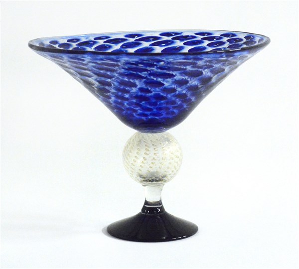 Grande coppa in vetro soffiato blu e trasparente incolore con fusto a sfera con inclusion regolare di bolle e foglia d'oro. Seconda metà secolo XX. (h cm 34; d cm 42,5)