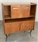 Mobile bar in legno multistrato, bordato e impiallacciato con parte inferiore a due ante, parte superiore con stipo centrale con apertura a ribalta e due ripiani laterali a giorno. Gambe in metallo, maniglie in legno sagomato. Italia, anni '50/'60. (cm 119x140x45) (difetti)