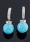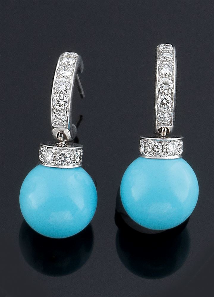 Coppia di orecchini in oro bianco con due boules di turchese diam 14,10 ca diamanti taglio brillante per complessivi ct 1,80 ca