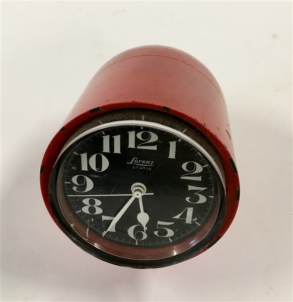 Orologio da tavolo modello "Static". Produzione Lorenz, Italia, 1984, disegno del 1959. Metallo verniciato rosso. Recante etichetta "Premio compasso d'oro" sotto la base. (cm 6,5 x10x8) (difetti)