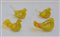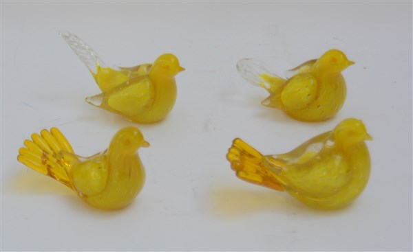 Lotto composto da quattro uccellini in vetro sommerso trasparente incolore e giallo a bolle. Italia, seconda metà secolo XX. (h max cm 8) (difetti)