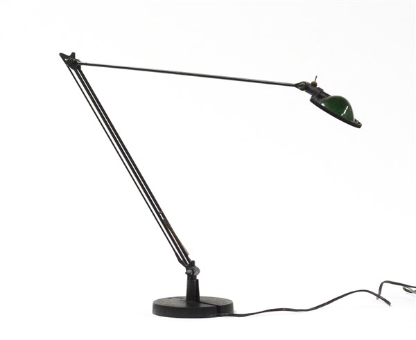 Lampada da tavolo modello "Berenice". Produzione Luceplan, Italia, anni '80. Alluminio pressofuso, giunti in nylon rinforzato, testa in rynite riflettore parabolico in vetro pressato color verde. Marcata. (h max cm 110) (difetti e mancanze)