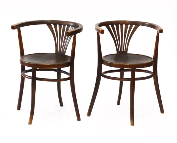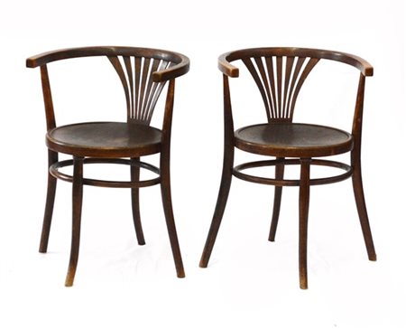 Coppia di poltroncine con struttura in legno di faggio curvato al vapore. Vienna, prima metà secolo XX. Recante etichetta cartacea sotto la seduta. (cm 51,5x72x50) (lievi difetti e restauri)