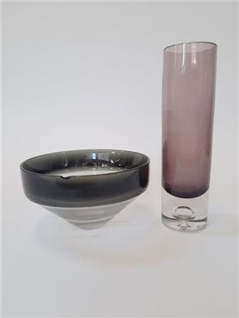 Lotto composto da un vaso cilindrico in vetro sommerso trasparente incolore e ametista chiaro e una ciotola centrotavola di forma conica in vetro trasparente incolore con bordo fumè. Anni '60. (vaso: h cm 29, d cm 8; ciotola: h cm 12, d cm 21) (difetti)