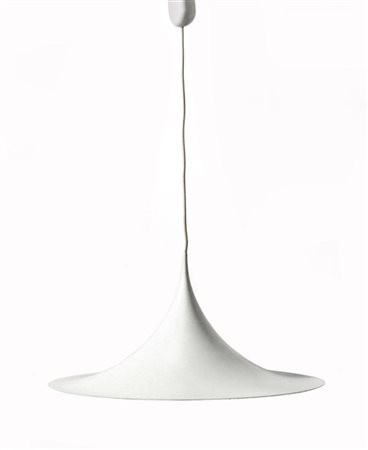 Lampada a sospensione a una luce con diffusore a cappello, alluminio smaltato bianco. Italia, anni '70. (h cm 80; d cm 60) (lievi difetti)