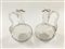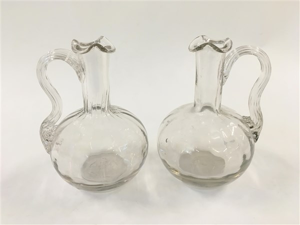 Coppia di caraffe in vetro soffiato trasparente incolore con prese decorate a scalature e nervature. Italia, produzione recente. (h cm 19) (lievi difetti)