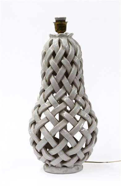 Lampada da tavolo con struttura in ceramica smaltata bianca sottovetrina. Italia, 1946. Siglata e datata sotto la base "S.M. 46". (h cm 52) (lievi difetti)