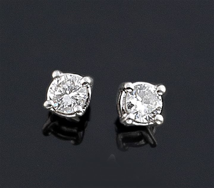 Coppia di orecchini in oro bianco, a lobo, con due diamanti taglio brillante per complessivi ct 0,45 ca