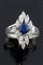 Anello in oro bianco a forma di losanga con al centro zaffiro taglio ovale e contorno di diamanti taglio navette per complessivi ct 1,30 ca