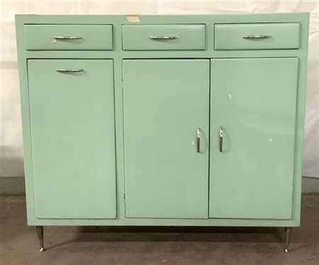 Mobile da bagno a tre ante e tre cassetti in multistrato verniciato verde chiaro, piedini in metallo, piano in opalina color salmone. Italia, anni '50. (cm 102x91x30) (difetti)