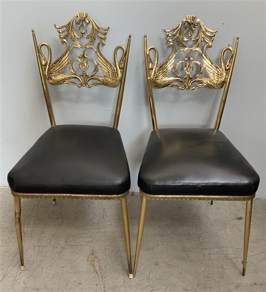 Coppia di sedie con struttura in ottone, schienale a giorno e cartella raffigurante volute e cigni, seduta imbottita e rivestita in similpelle nera. Italia, anni '50. (cm 44x92,5x55) (lievi difetti)